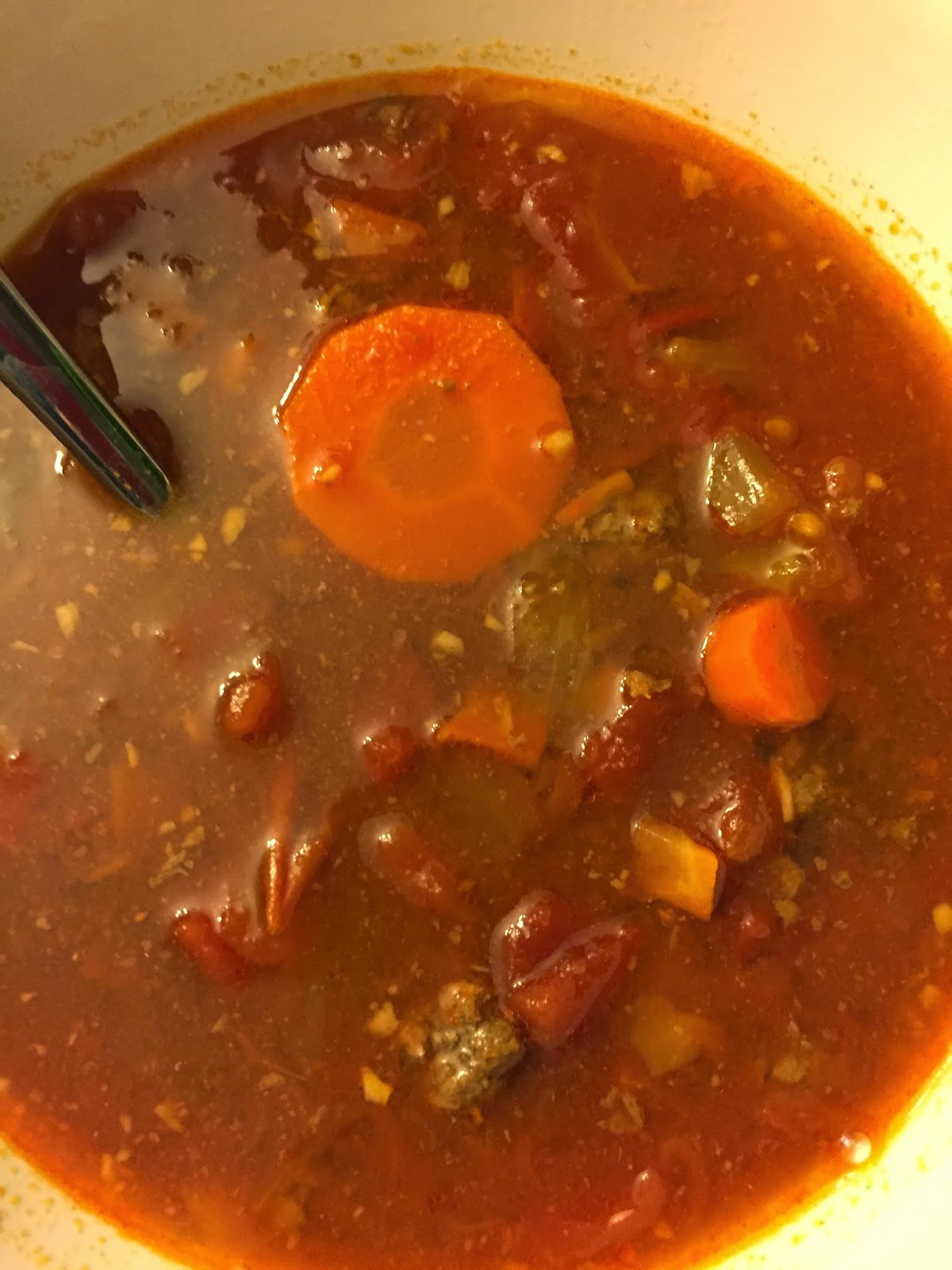 When the carrots begin to soften, about 20 minutes, I added the browned ground turkey into the stock pot. Then I added these ingredients and simmered another 20 minutes: